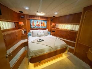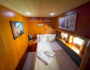 Bu muhteşem motoryat, 3 kamaraya sahiptir: 1 master, 1 twin ve 1 double kabin. Toplamda 6 kişilik kapasitesi ile sevdiklerinizle keyifli bir tatil geçirebilirsiniz. Yatta 2 banyo, 2 tuvalet ve klima bulunmaktadır, böylece konforunuz her an ön planda olacaktır.
