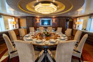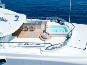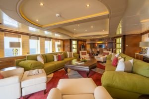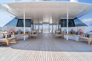 Salonda sıcak bir palet ve iskele ve sancakta iki büyük kanepe ve kıçta 12 kişilik resmi bir yemek masası bulunmaktadır. Dışarıda, geniş güneşlenme terası, bir jakuzi, rahat güneşlenme minderleri ve önde bulunan bir bar ile birkaç ayrı alana bölünmüştür. Kıç taraftaki açılır kapanır tente, güneşten biraz uzaklaşmak isteyen konuklar için gölge sağlar.